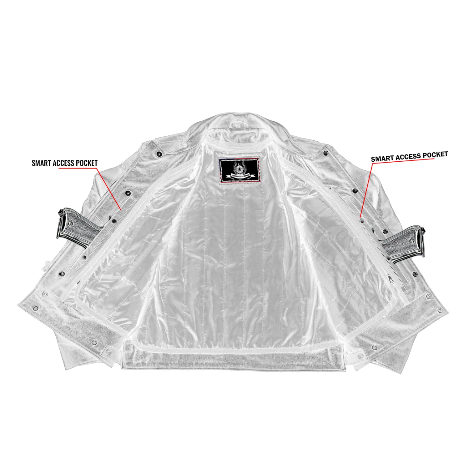 - Dual-entry pleated breast pockets with flap and silver snap buttons for easy access