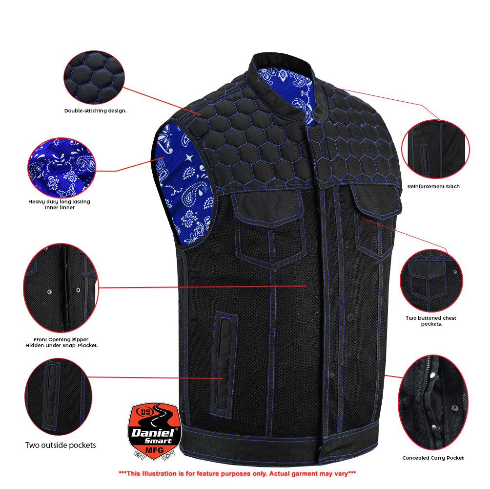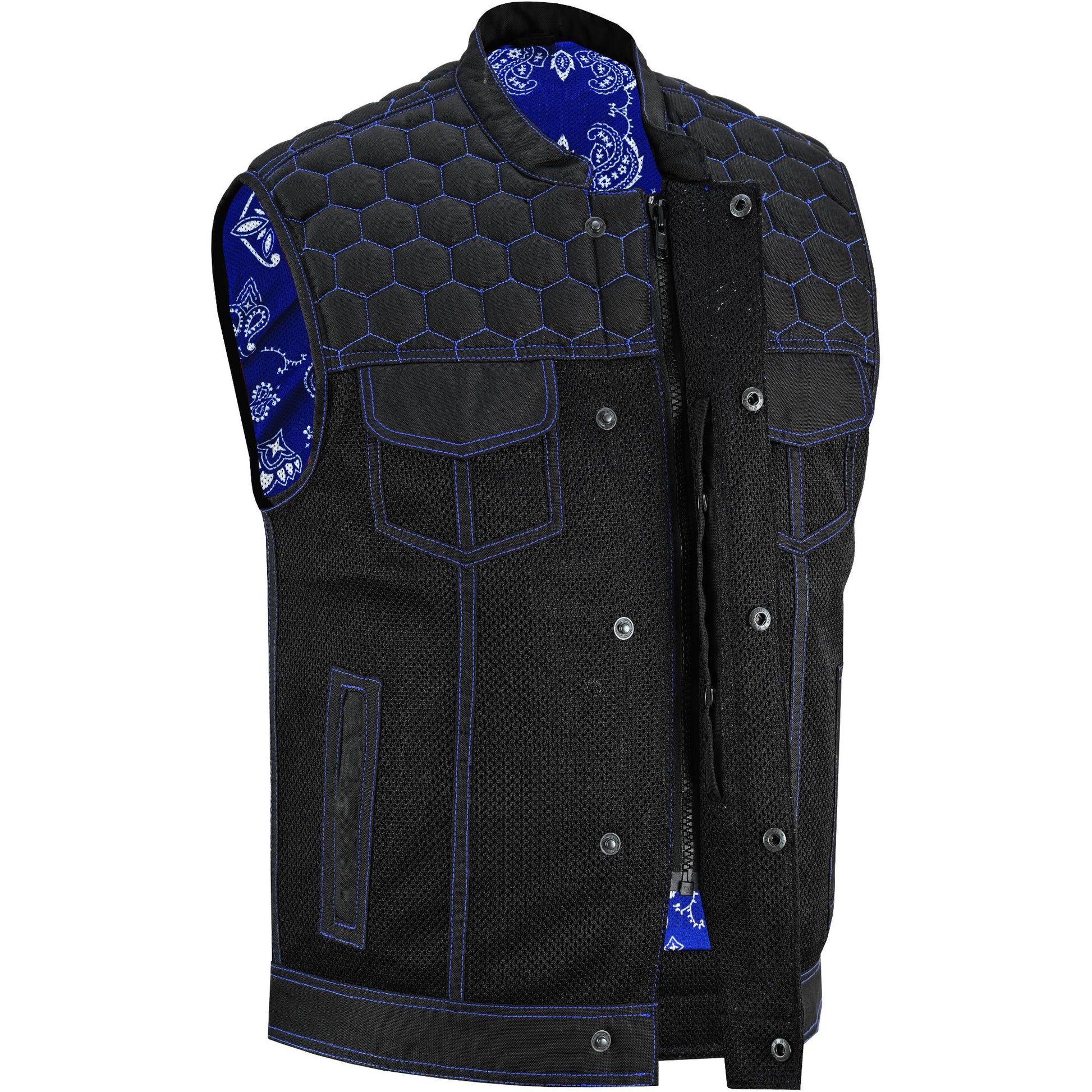 Our Blue Soul Black and Blue Mesh Textile Vest features a durable mesh construction with vibrant black accents. It includes concealed carry and secure chest pockets with snap button closures for convenience. The hidden front zipper with snap-placket reinforced stitching and built-in hanging loop adds to its practicality and style. This vest is perfect for those who want a striking, functional Vest to match their riding styles.