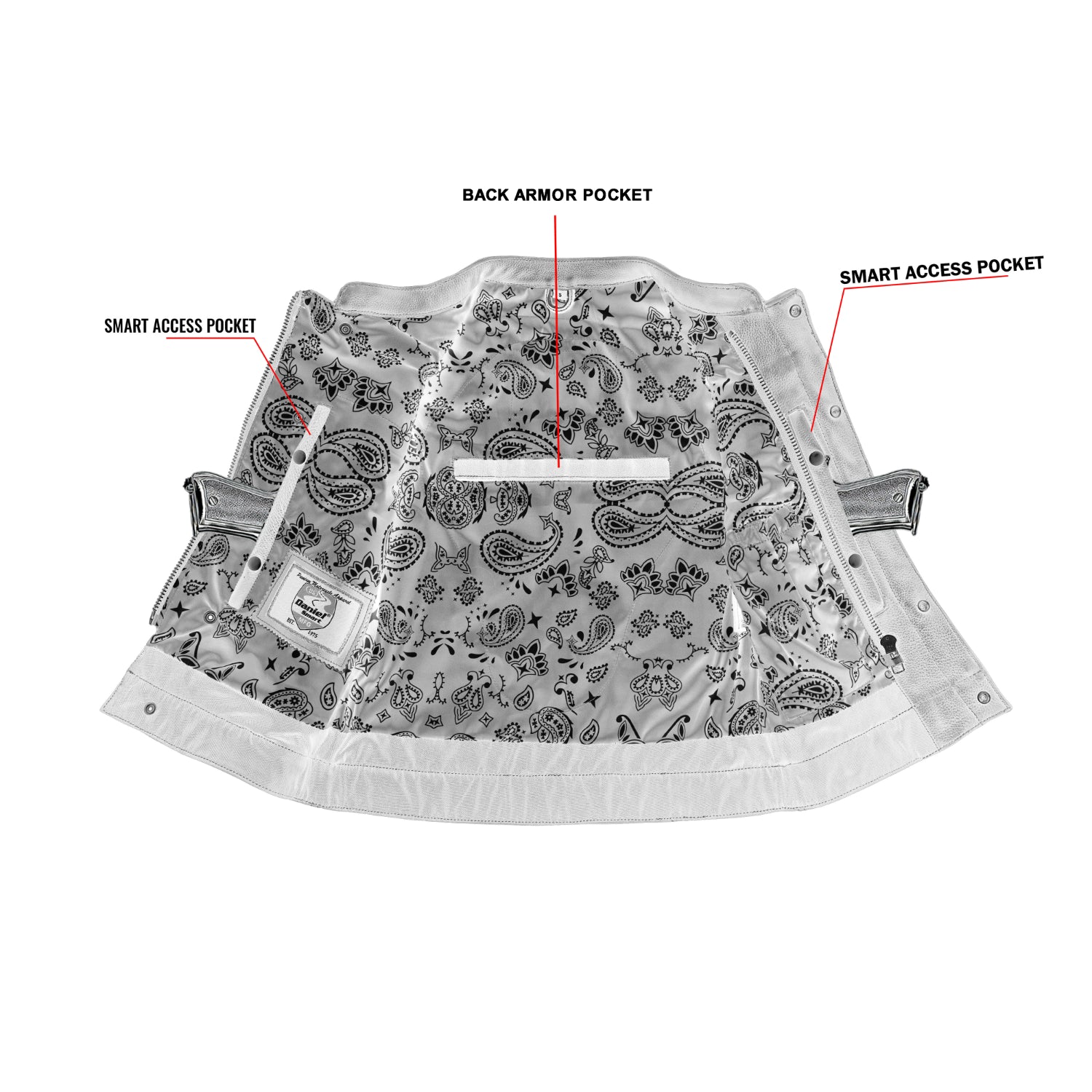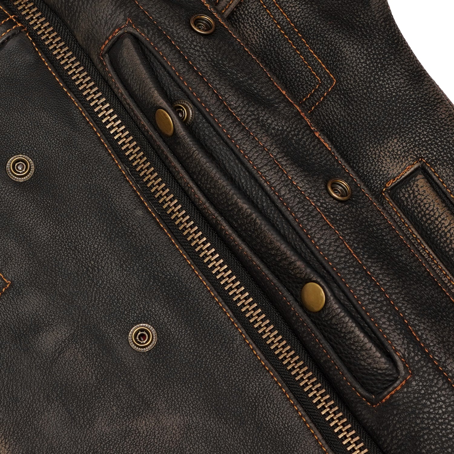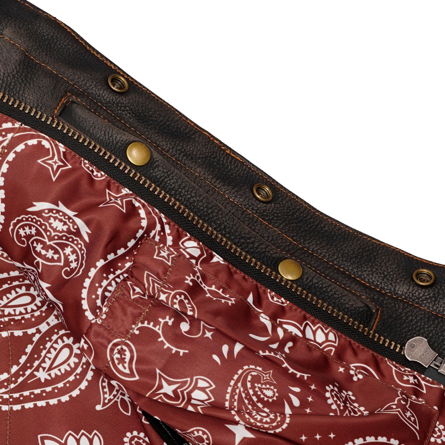 Strong, stylish, and made to move with you—our Bold Beauty women’s leather vest blends classic design with modern functionality. Crafted from premium cow rub buff brown leather, this vest delivers durability and a polished look ride after ride. The stand collar adds a touch of sophistication. Equipped with two outside buttoned hand pockets, multiple inside pockets—including concealed carry and mobile pockets—and a front YKK antique zipper hidden under a snap placket, this vest keeps your essentials secure and organized. Finished with sublimated satin lining, reinforced shoulders, and heavy-duty stitching, the Bold Beauty leather vest combines protection, style, and comfort for every journey. Gear up and ride with confidence.