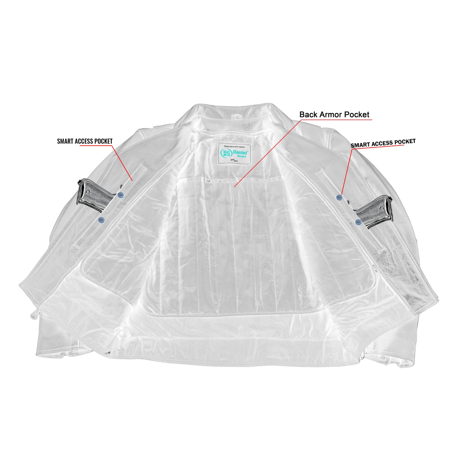 - Two concealed carry pockets with elastic holsters.