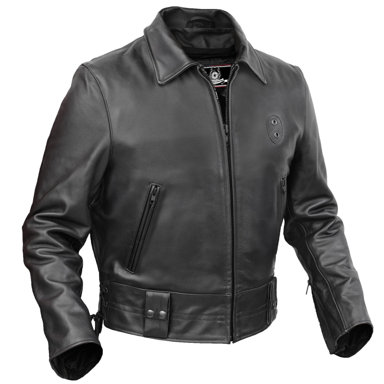 - All-leather badge tab on left breast for an authentic police-inspired design
