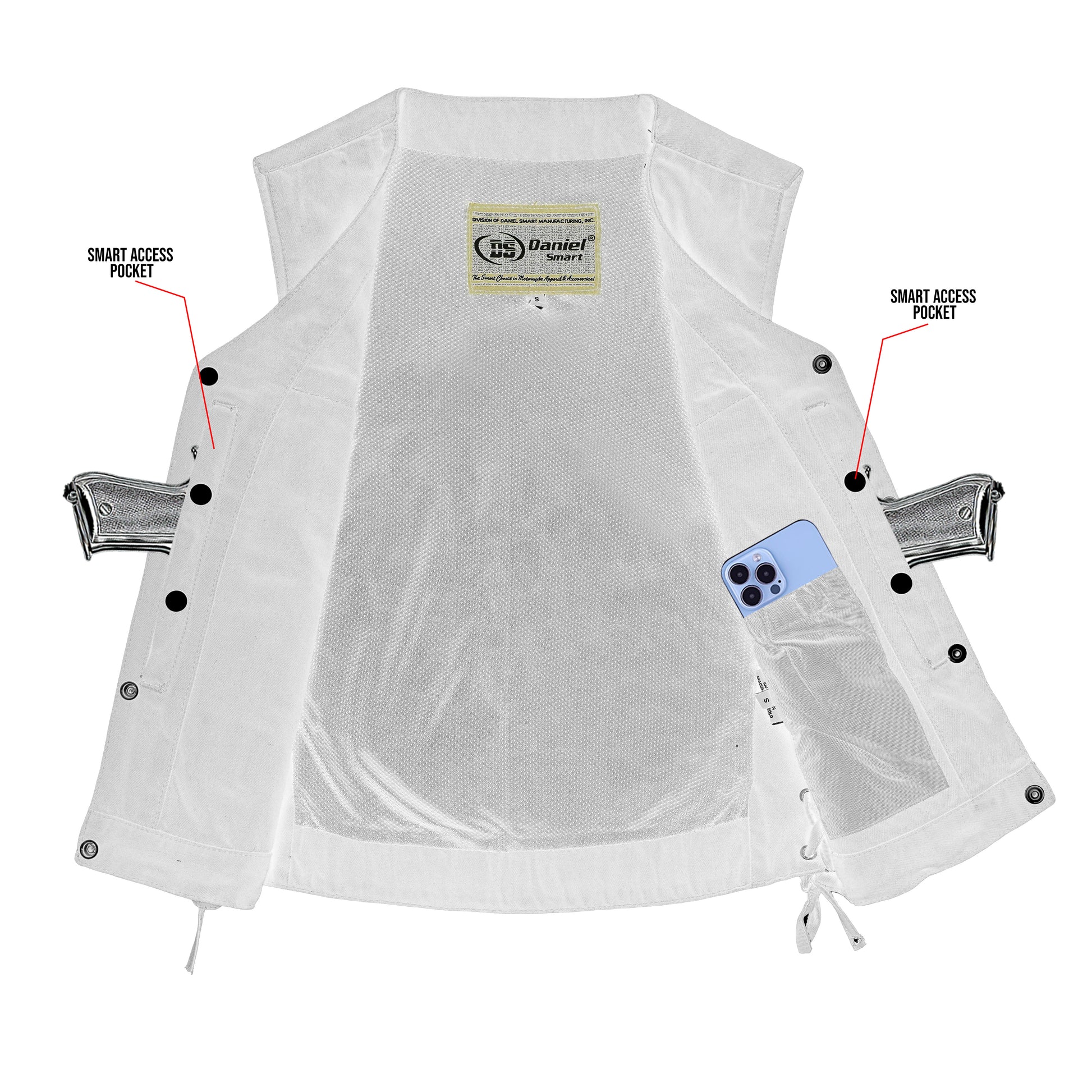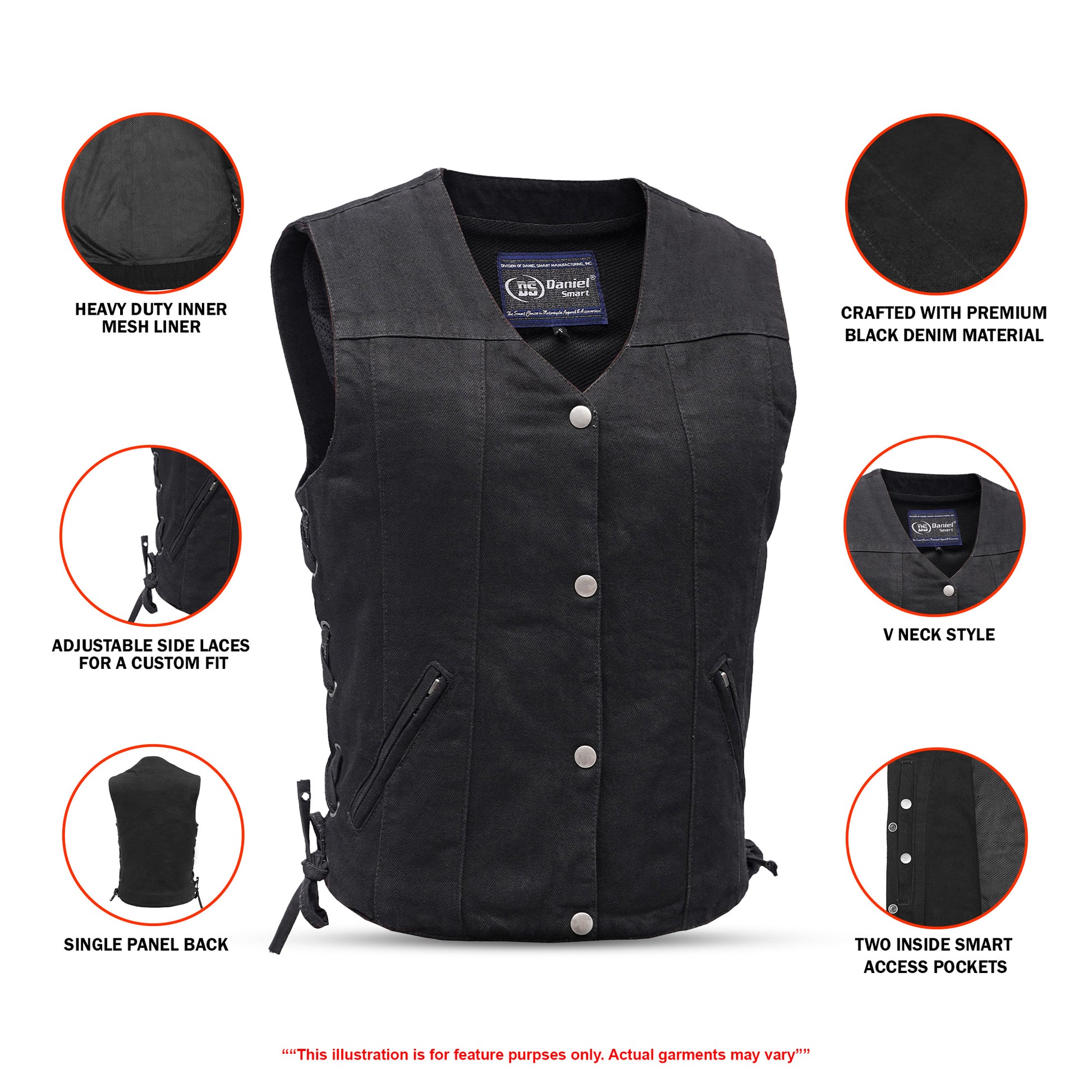 Our women's black denim concealed carry biker vest offers the high quality and versatility you want on the road. It includes a single-panel back perfect for accessorizing with airbrushed art or club logos and patches. You can get the fit you like with our side laces, which allow for precise adjustments. The vest has two outside zippered pockets as well as two inside Smart Access Pockets, which are made from unique heavy-duty textiles and include built-in holsters and a snap closure.