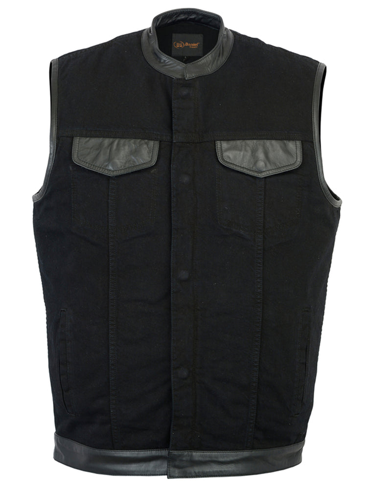 DM992 Men's Black Denim Single Panel Concealment Vest W/ Leather Trim