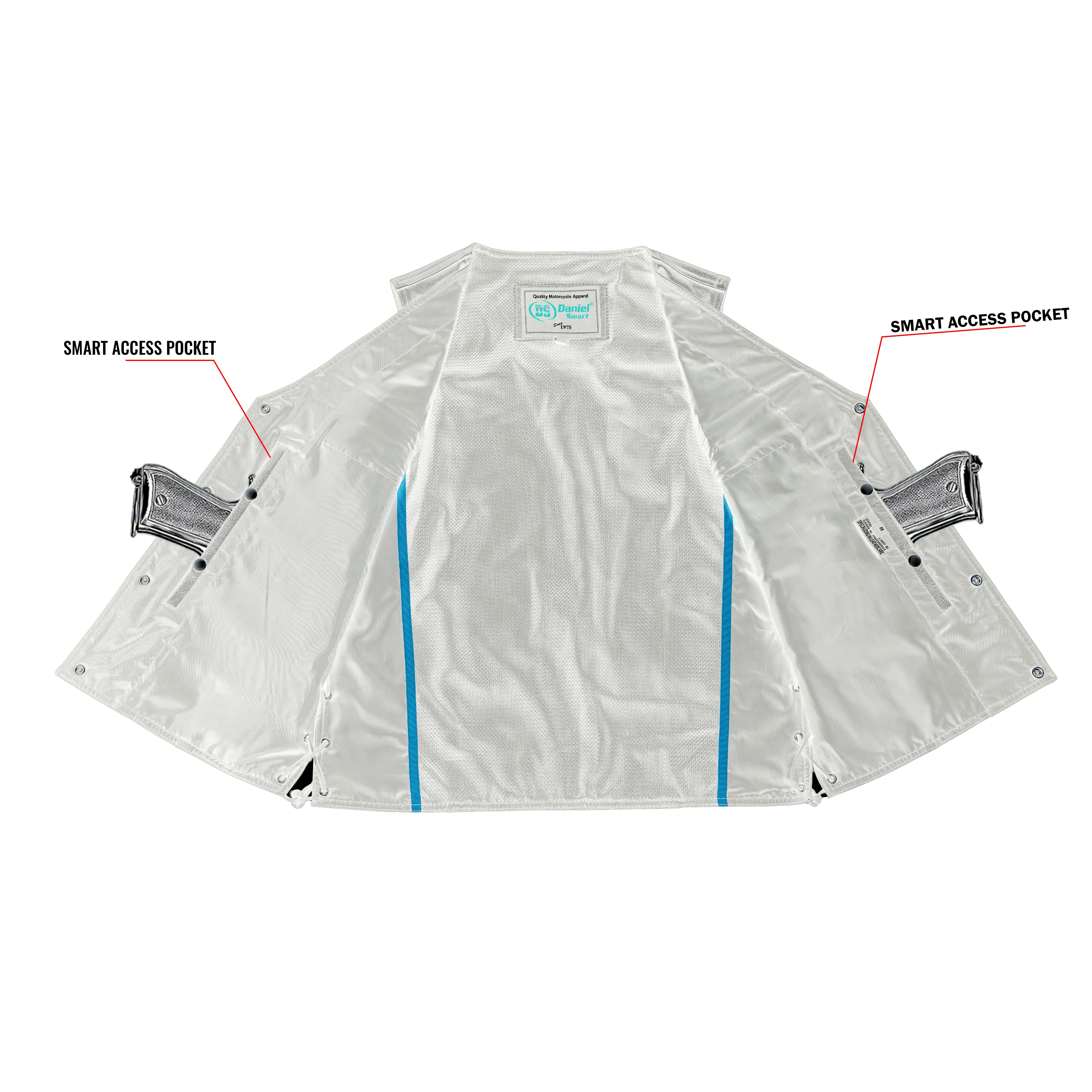 2 inside Smart Access Pockets made of special heavy-duty textile with built-in holsters and snap closure.