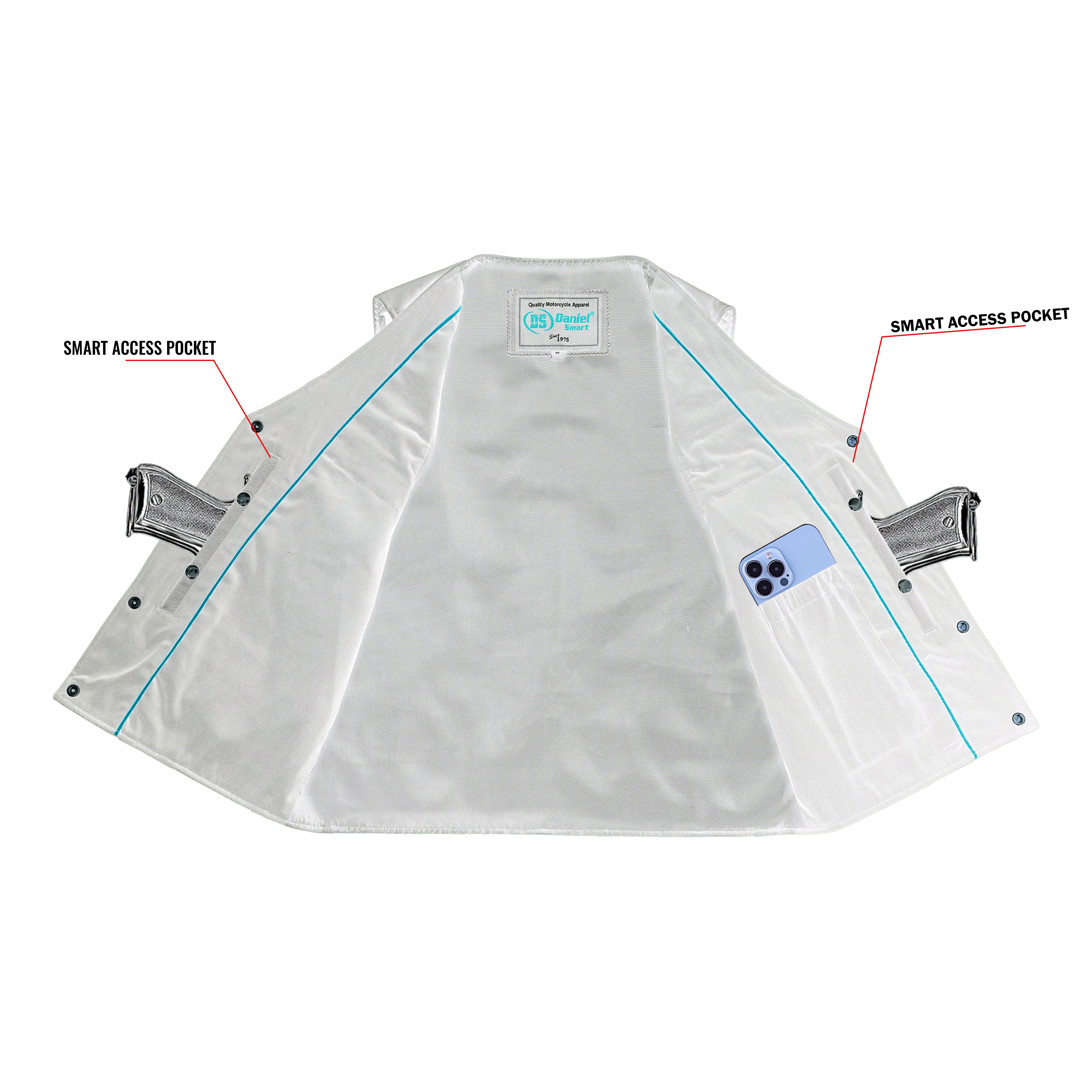 You'll also have two Smart Access Pockets made of durable textile. Both pockets contain holsters and snap closures to keep your Safety Tools securely in place. We reinforce the shoulders for maximum concealing everywhere you go.