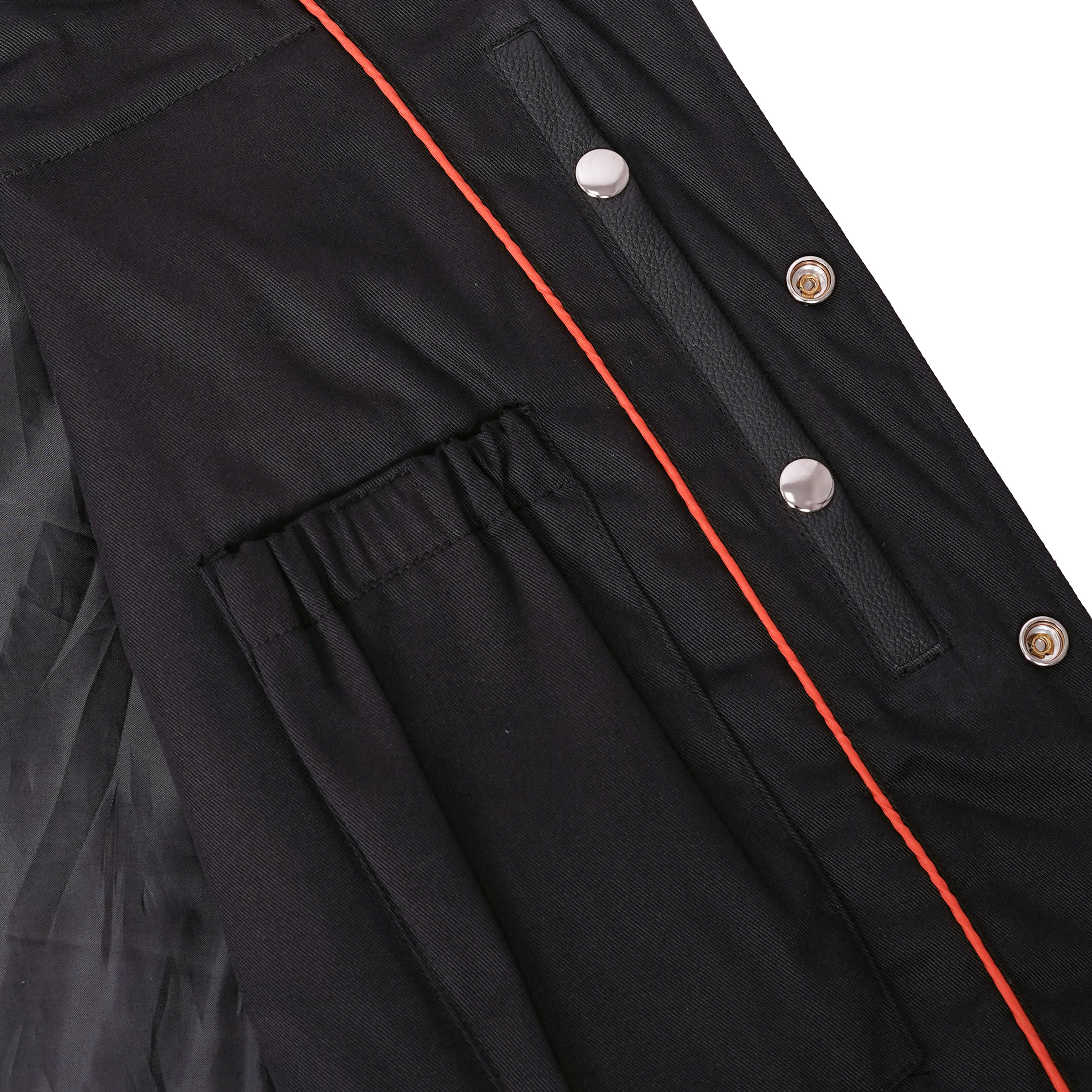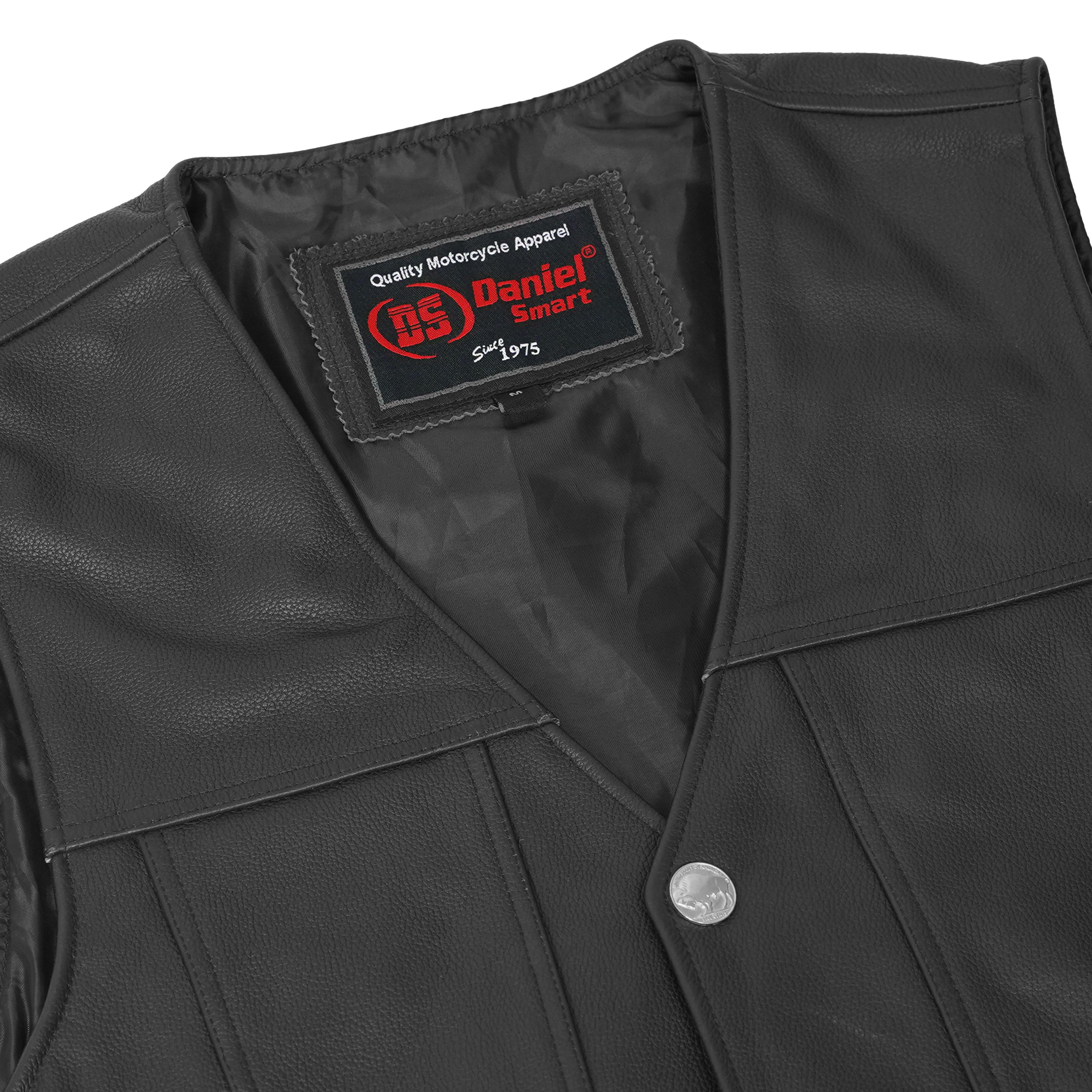 This vest is made from soft, premium-grade milled cowhide 1.2 - 1.3mm leather. The front panels and silver buffalo nickel snaps elevate the classic black leather. You can customize the leather with patches, artwork or embroidery.