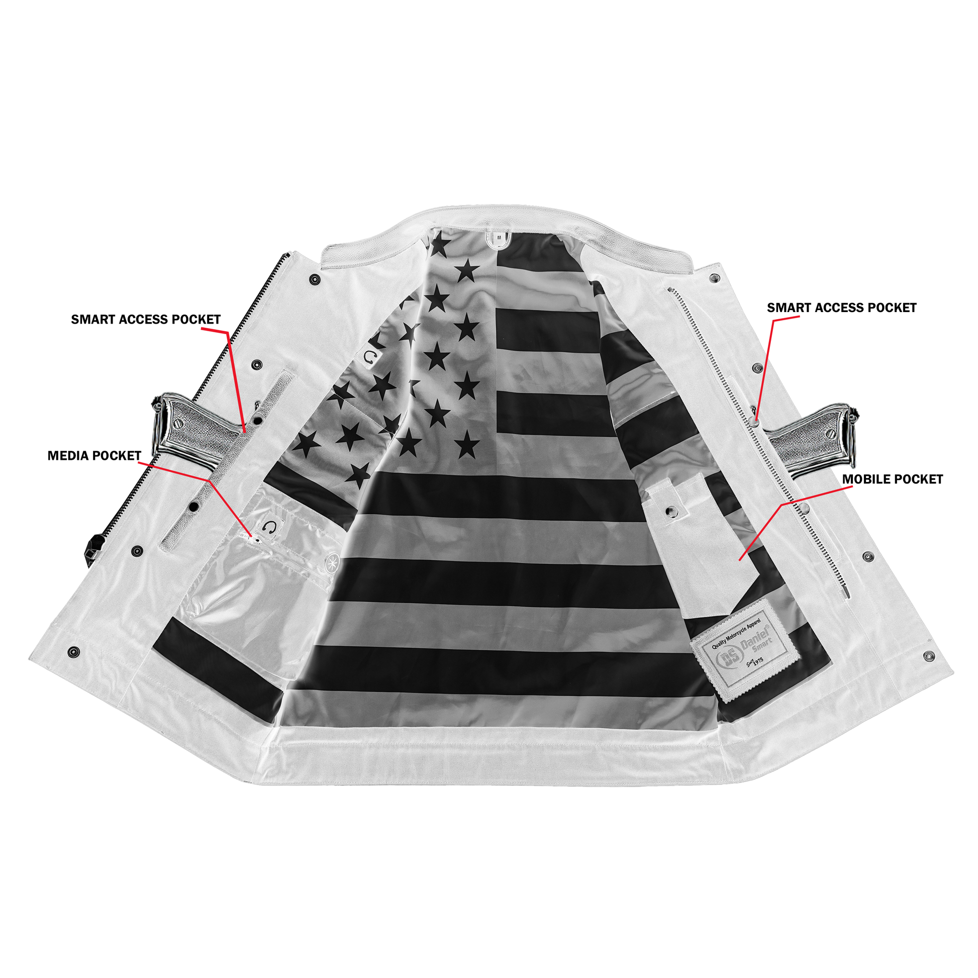 2 upgraded style Smart Access Pockets between the snap and the zipper made of special heavy-duty textile with built-in holsters and snap closure.