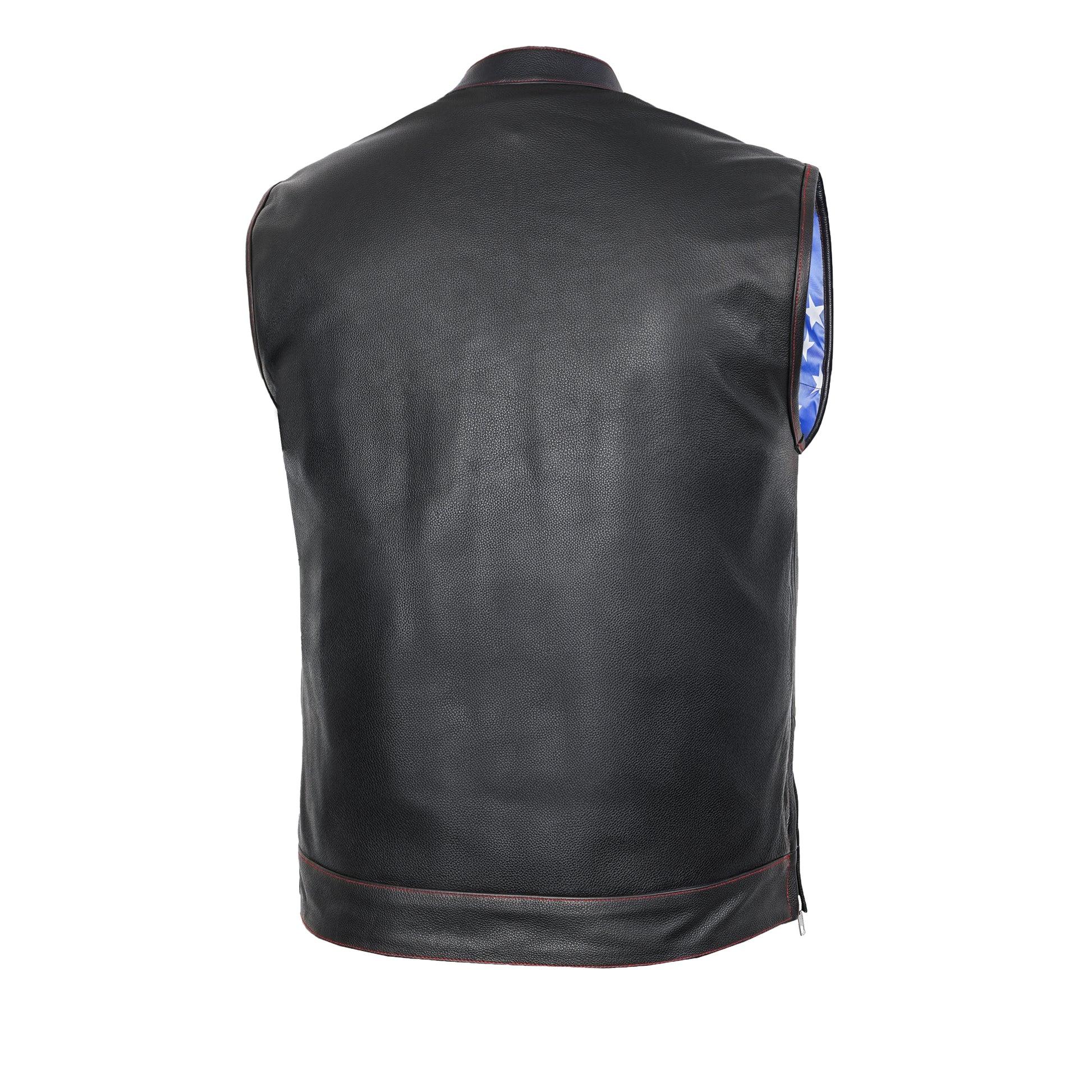 DS165 MEN'S LEATHER VEST WITH RED STITCHING AND USA INSIDE FLAG LININ