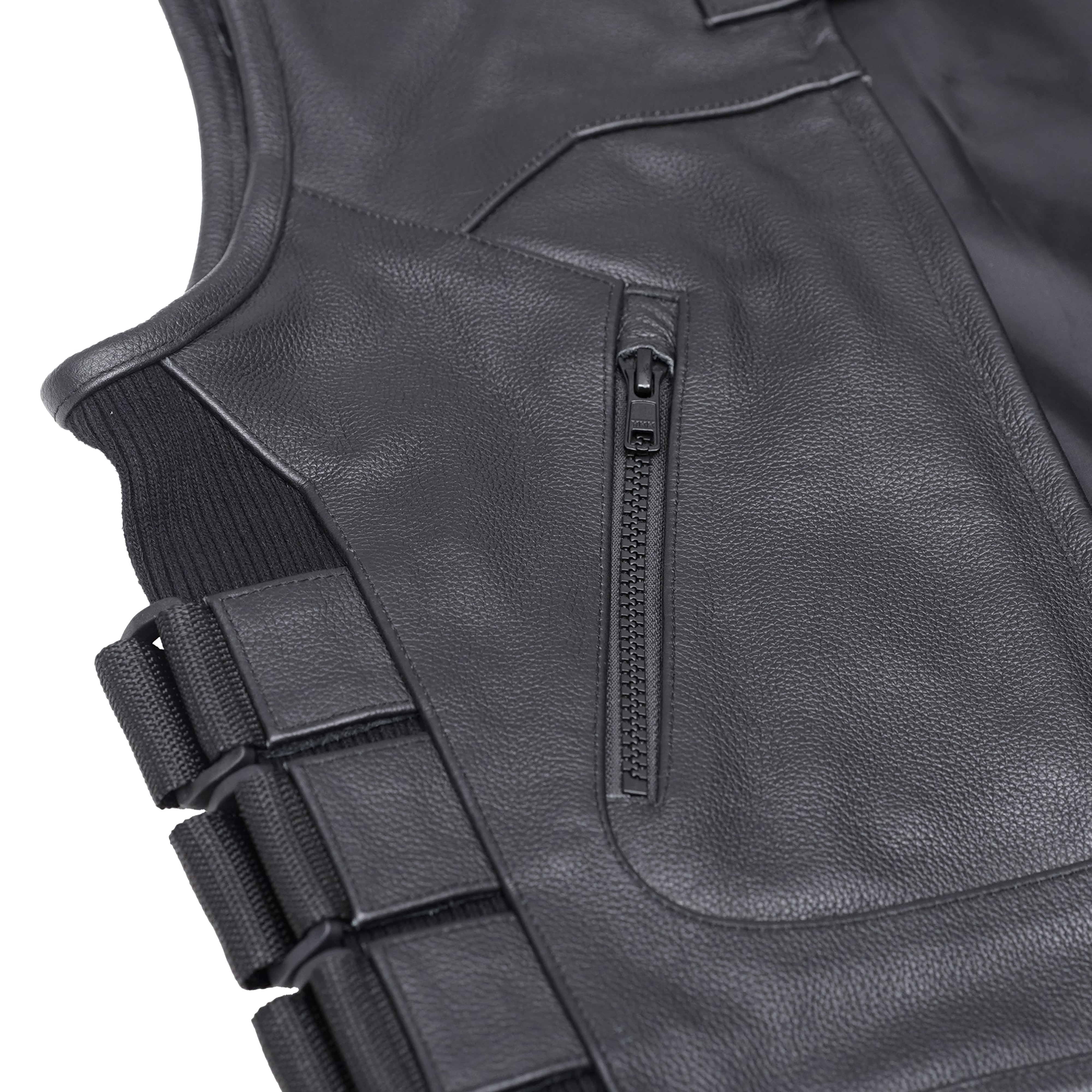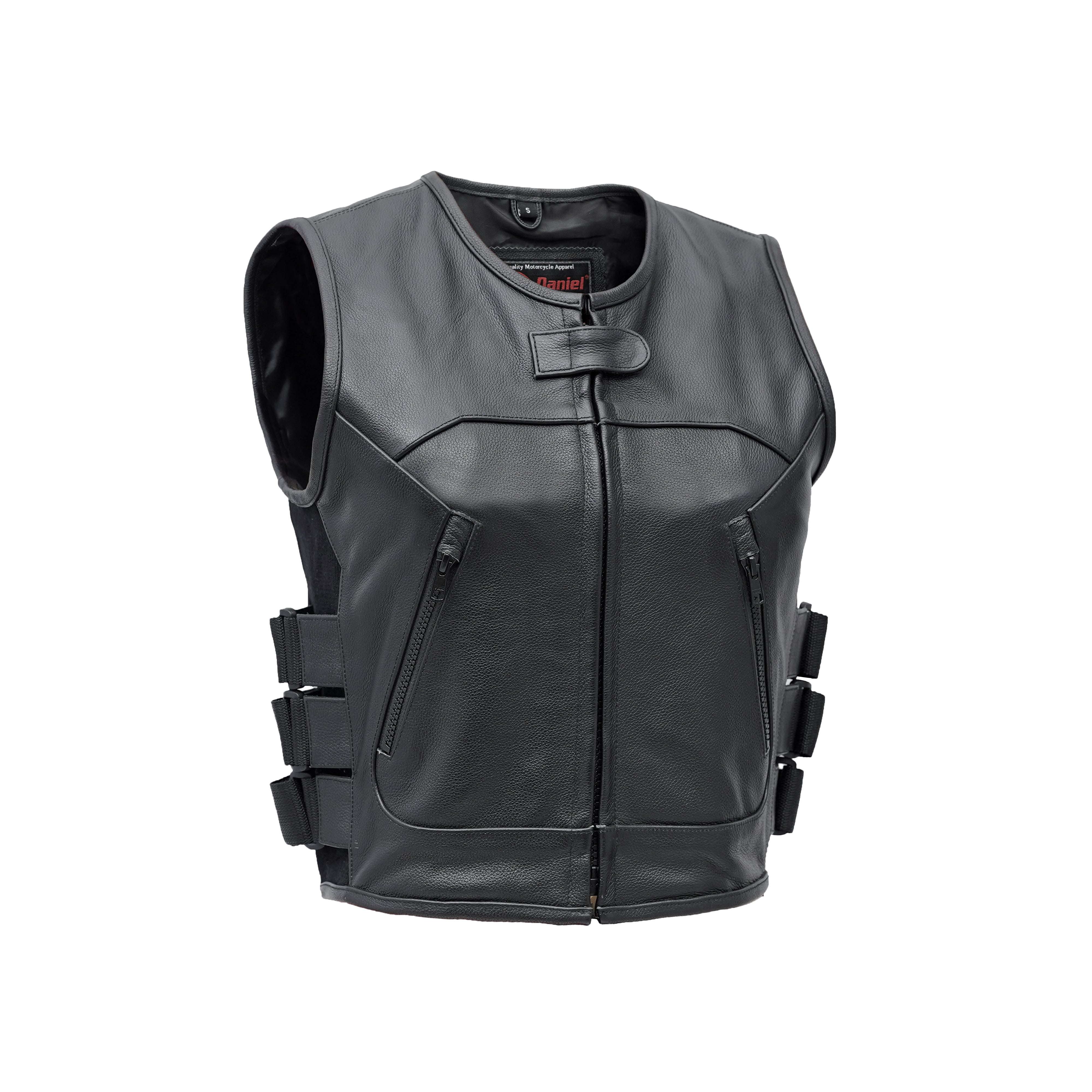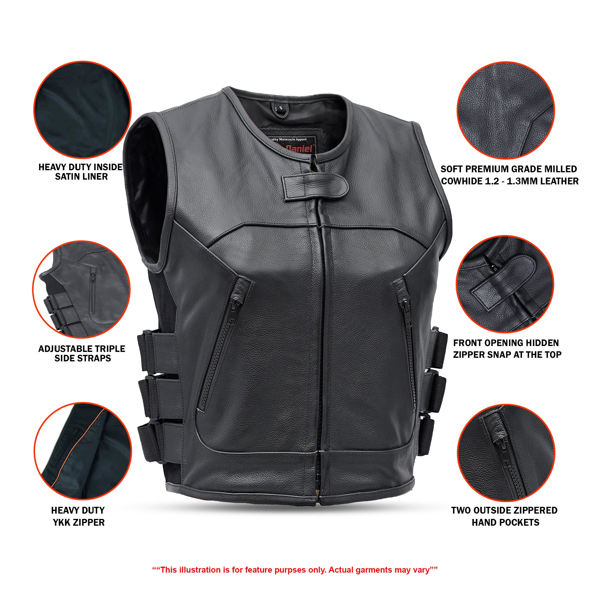 Adjustable triple side straps over heavy spandex side panels for styling and additional size adjustment.