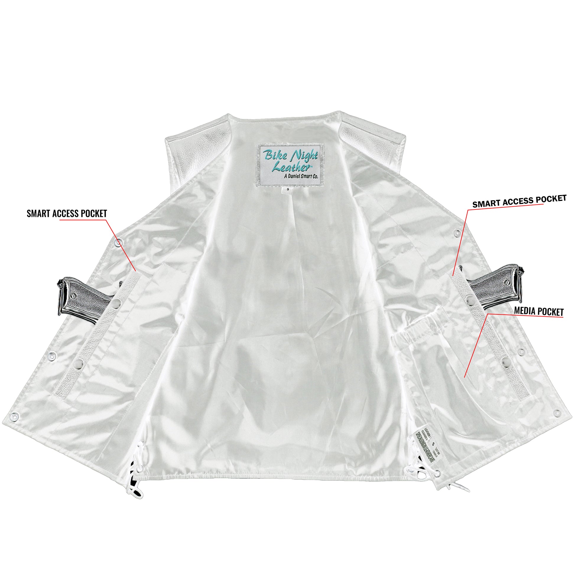 2 inside Smart Access Pockets made of special heavy-duty textile with built-in holsters and snap closure.