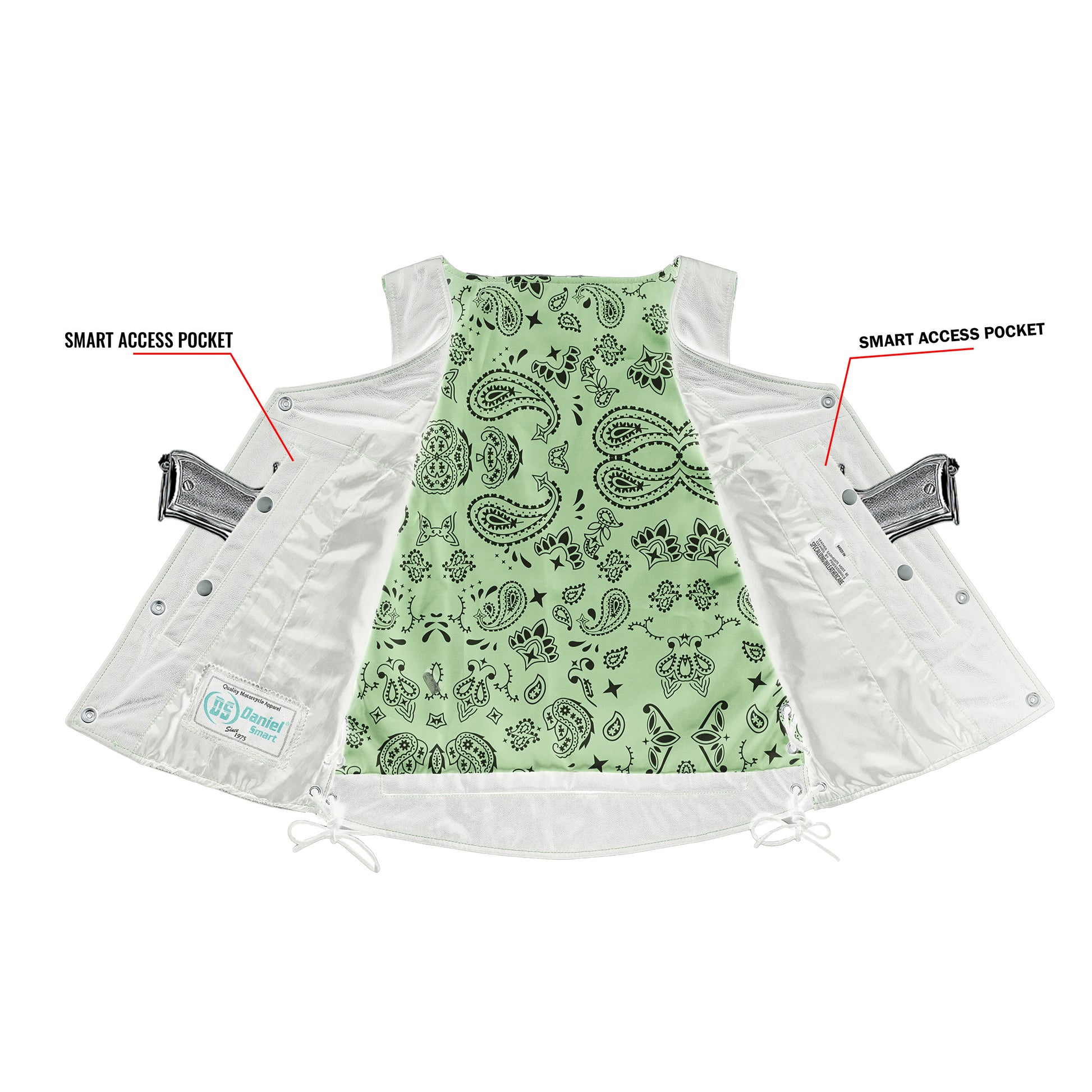 2 inside Smart Access Pockets made of special heavy-duty textile with built-in holsters and snap closure.