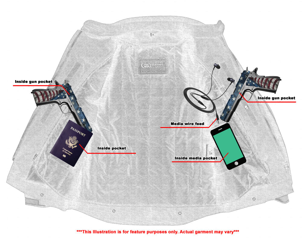 2 inside Smart Access Pockets made of special heavy-duty textile with built-in holsters and snap closure.