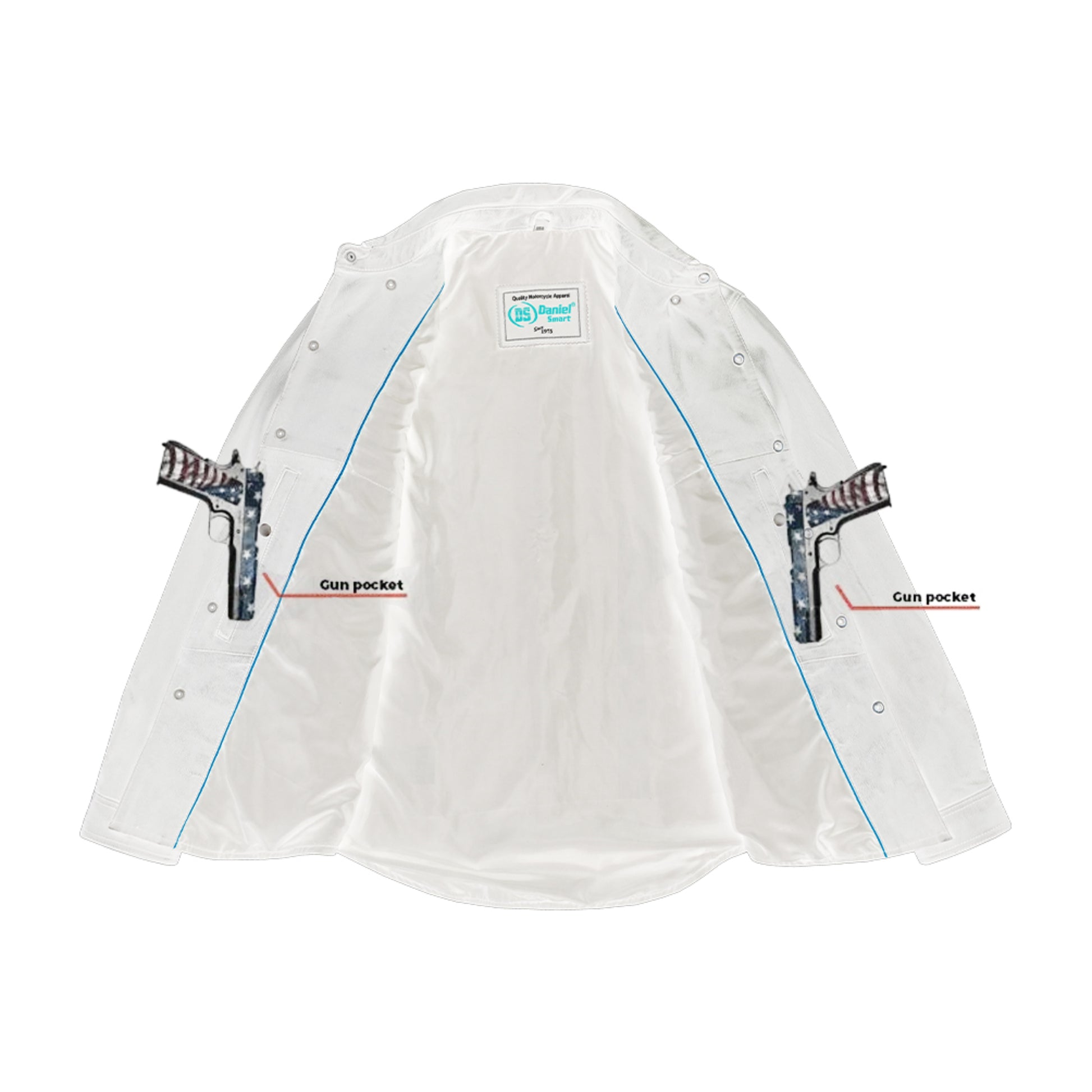 2 inside Smart Access Pockets made of special heavy duty textile with built-in holsters and snap closure.