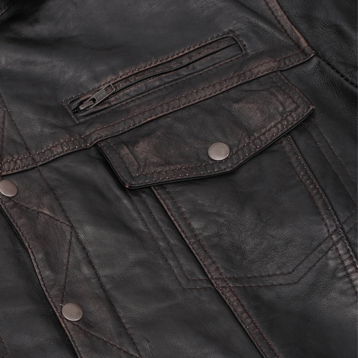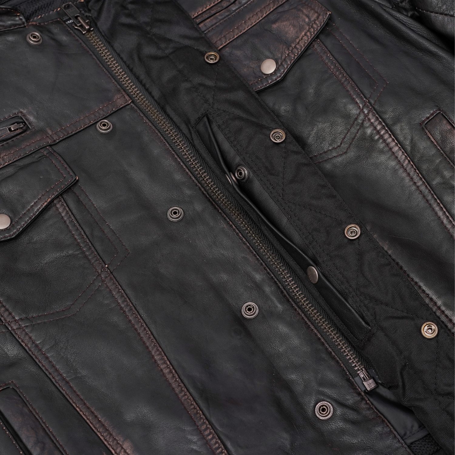 Front gun metal zipper hidden under snap-placket blocks wind & rain.