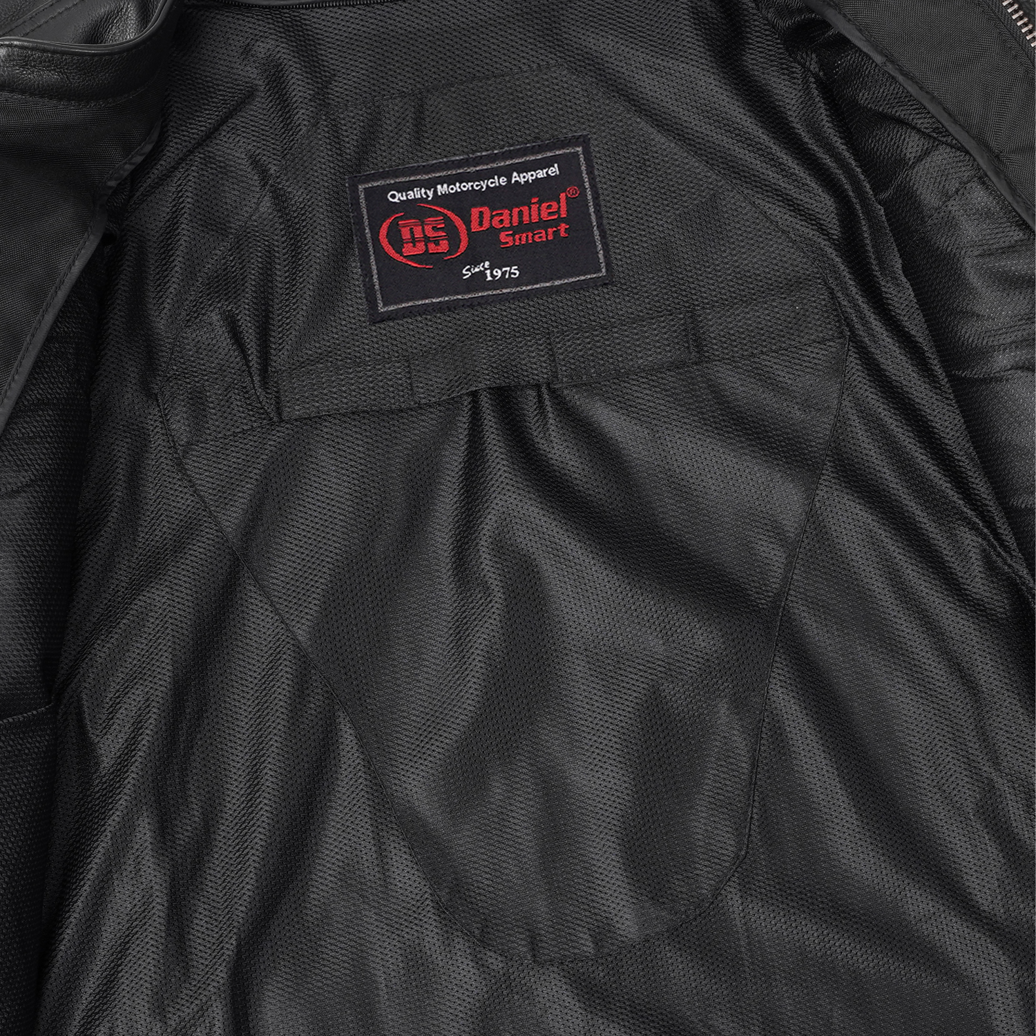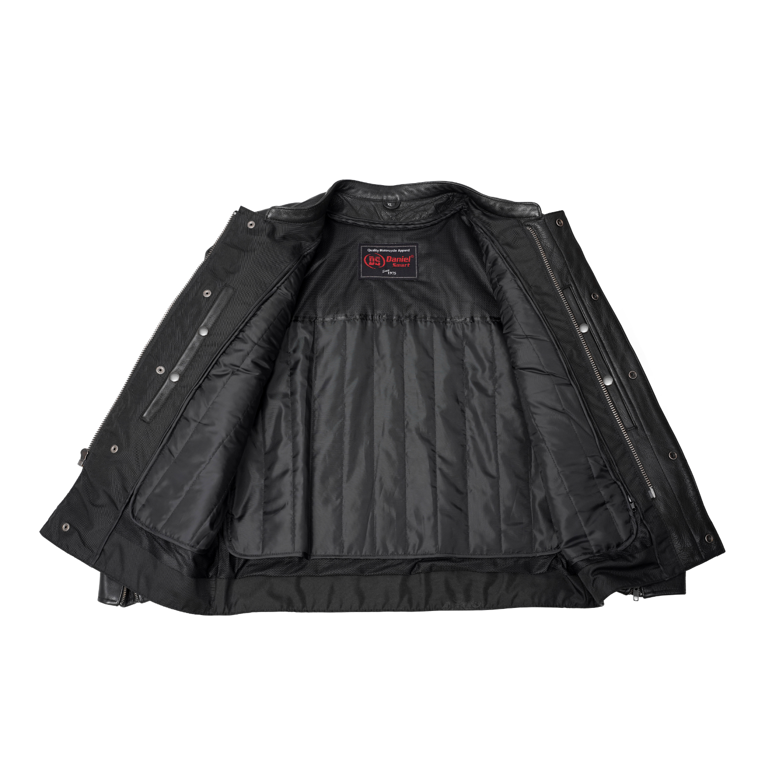Front black metal # 10 zipper hidden under snap-placket blocks wind & rain.