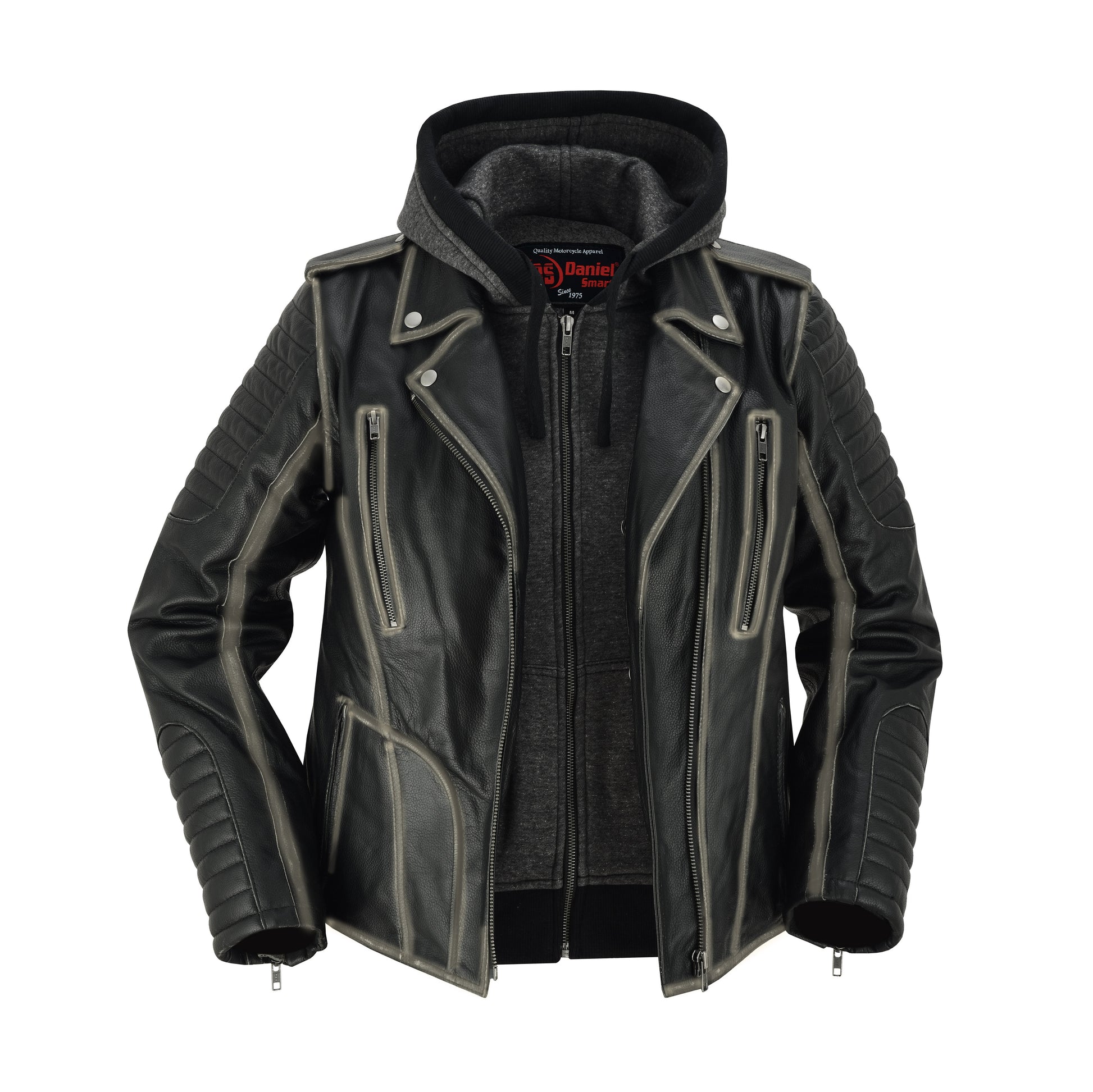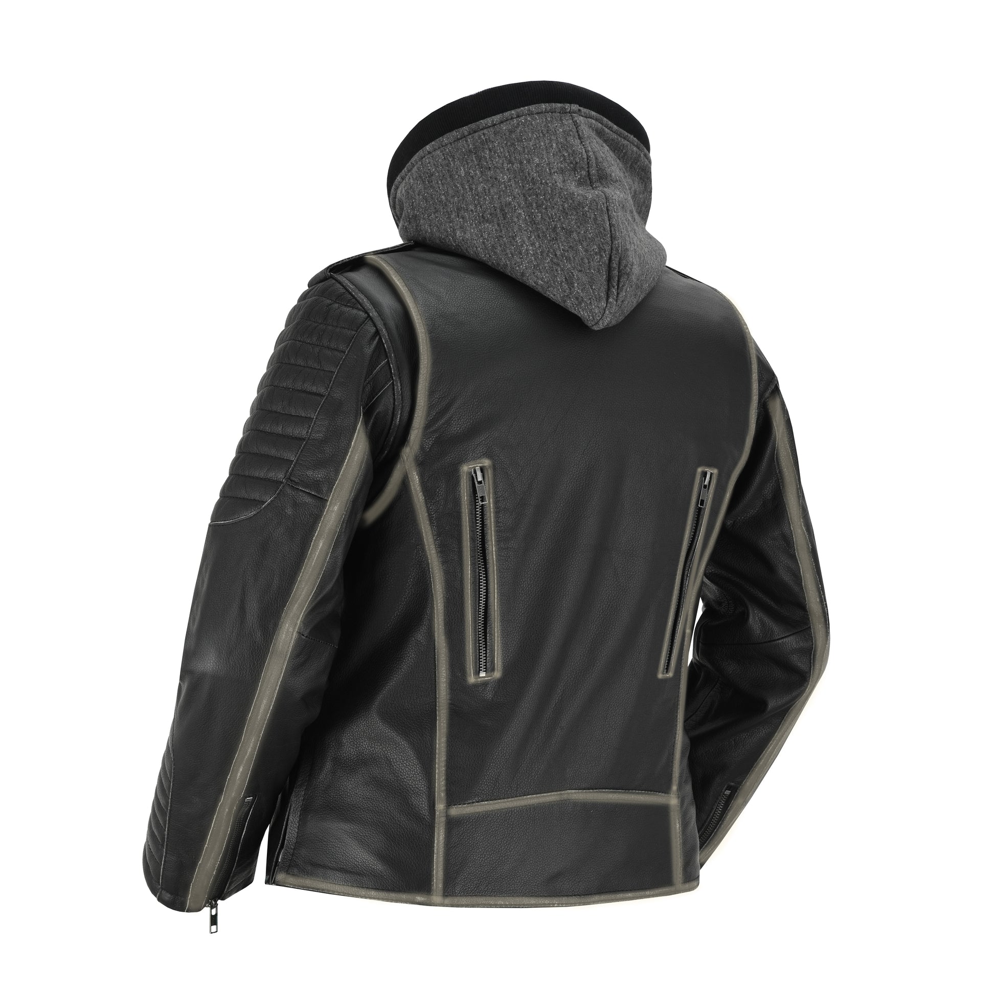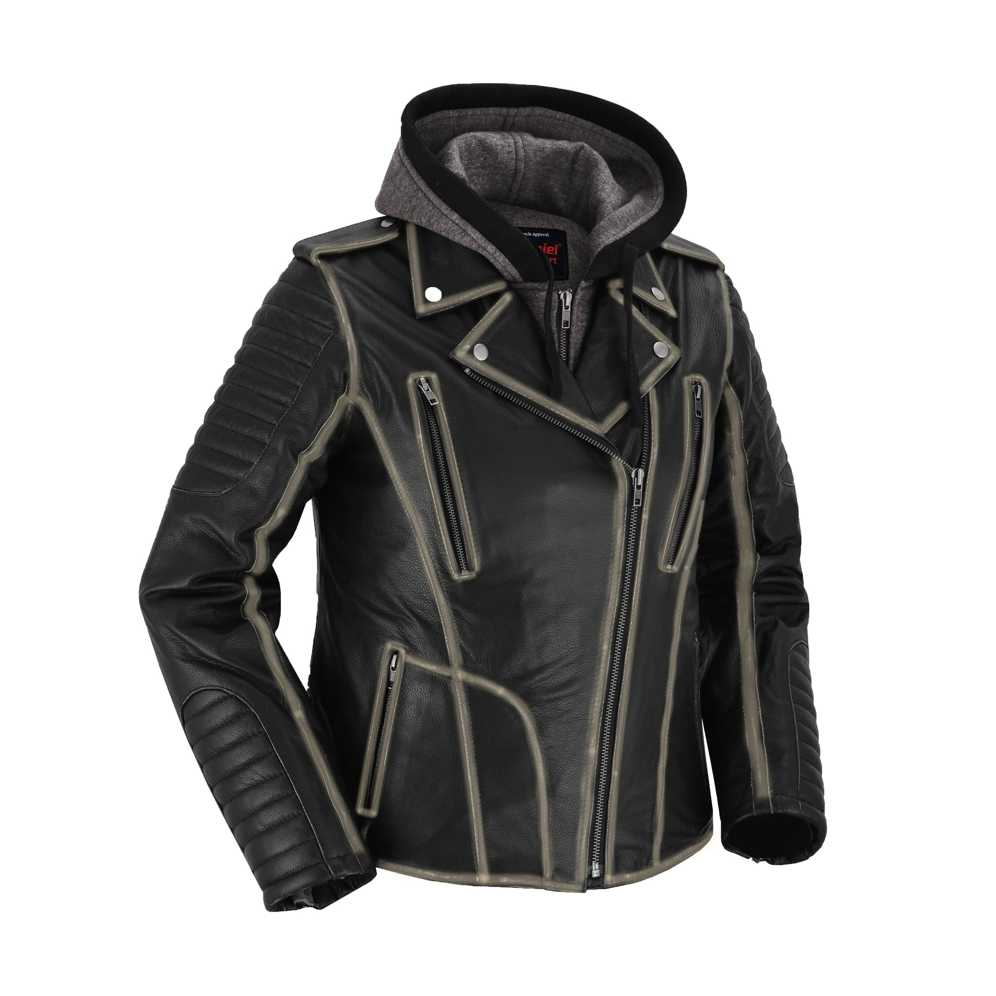 The Women's M/C Jacket with Rub-Off Finish is crafted from soft premium rub-off drum-dyed cowhide 1.2–1.3mm, providing a perfect blend of durability and style. Featuring a snap-down lapel and collar, this jacket offers a sleek, classic look. The removable full hoodie liner adds versatility, allowing you to adjust for varying weather conditions. With chest and back vents, it ensures optimal airflow, keeping you cool while riding.