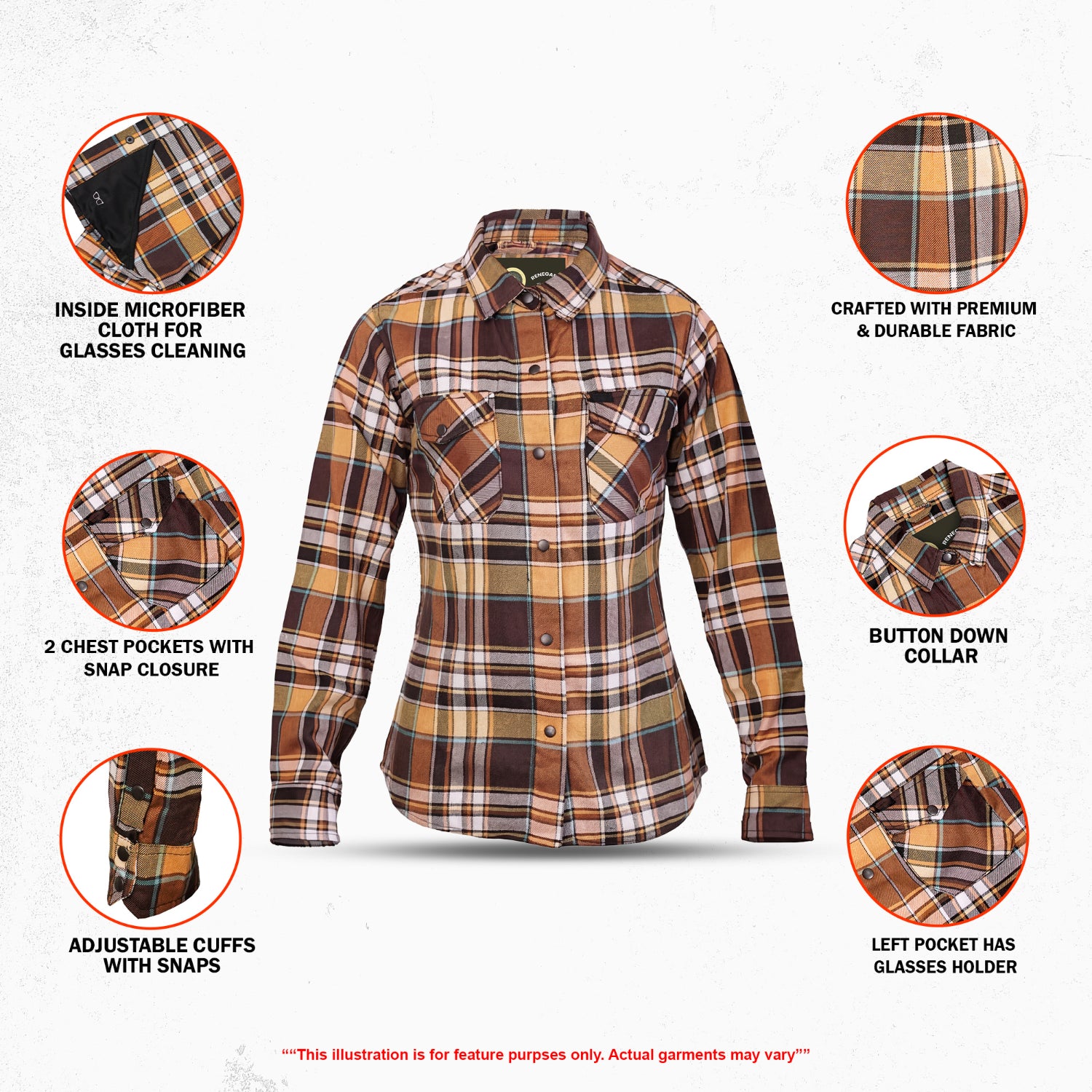 Adjustable snap cuffs allow for a customized fit, and an interior microfiber cloth keeps your glasses clean wherever the ride takes you. Tailored for a women’s silhouette with American sizing and added length, this flannel is perfect for riders and adventurers who value comfort without compromising style. Strong. Stylish. Timeless. Ride bright in the Golden Girl Flannel.