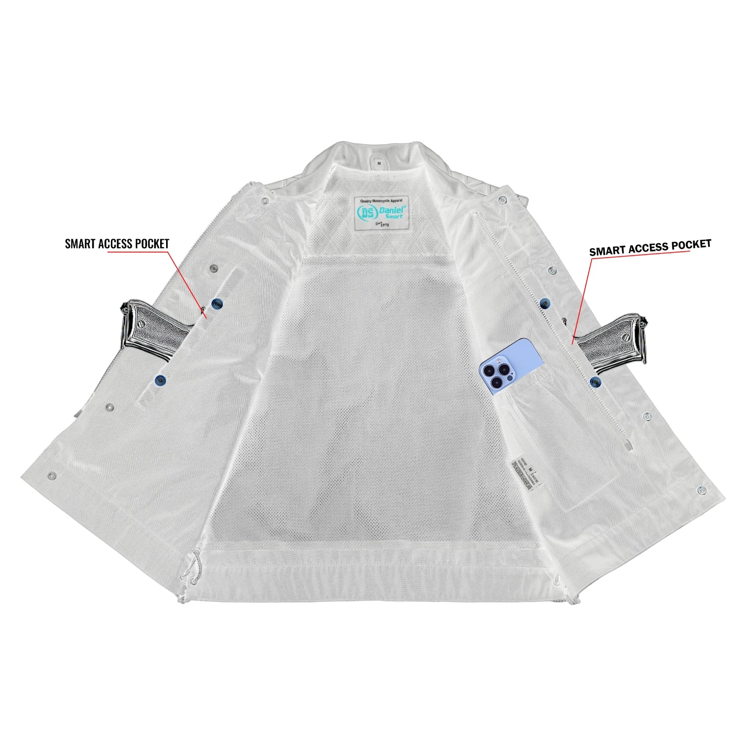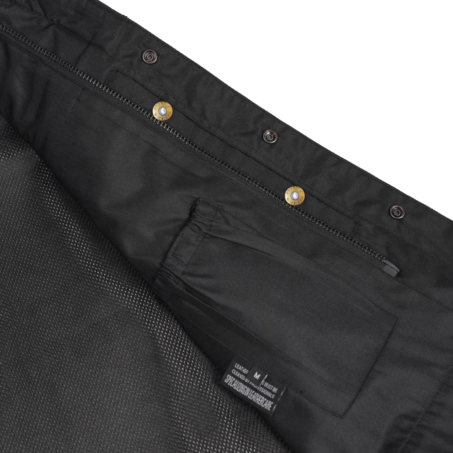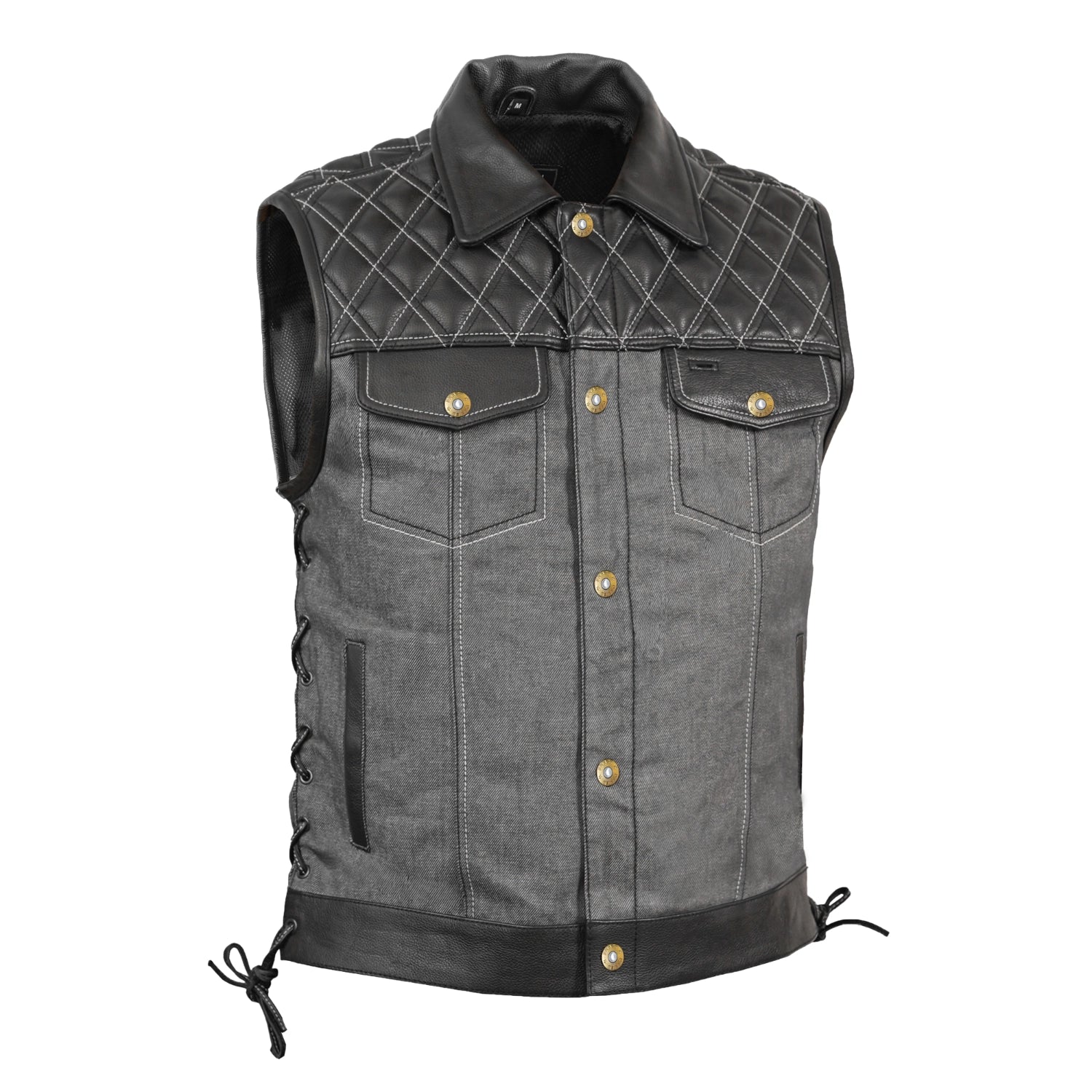The Gray Gunner Men’s Leather & Denim Vest blends rugged performance with refined style. Built from premium black leather on the upper front, back, and lower belt, paired with gray denim panels, it delivers strength, flexibility, and standout contrast. Inside, Cordura and Cotton PU linings add durability, while 4mm foam padding ensures comfort and structure. The double diamond black-and-white embroidery, leather-trimmed snap collar, and oxidized YKK zipper give it a bold edge. With concealed carry pockets, snap chest and hand pockets, and side lace adjustments, the Gray Gunner offers both functionality and flair. Perfect for riders who value quality craftsmanship, reliable protection, and a vest that reflects their true biker identity.