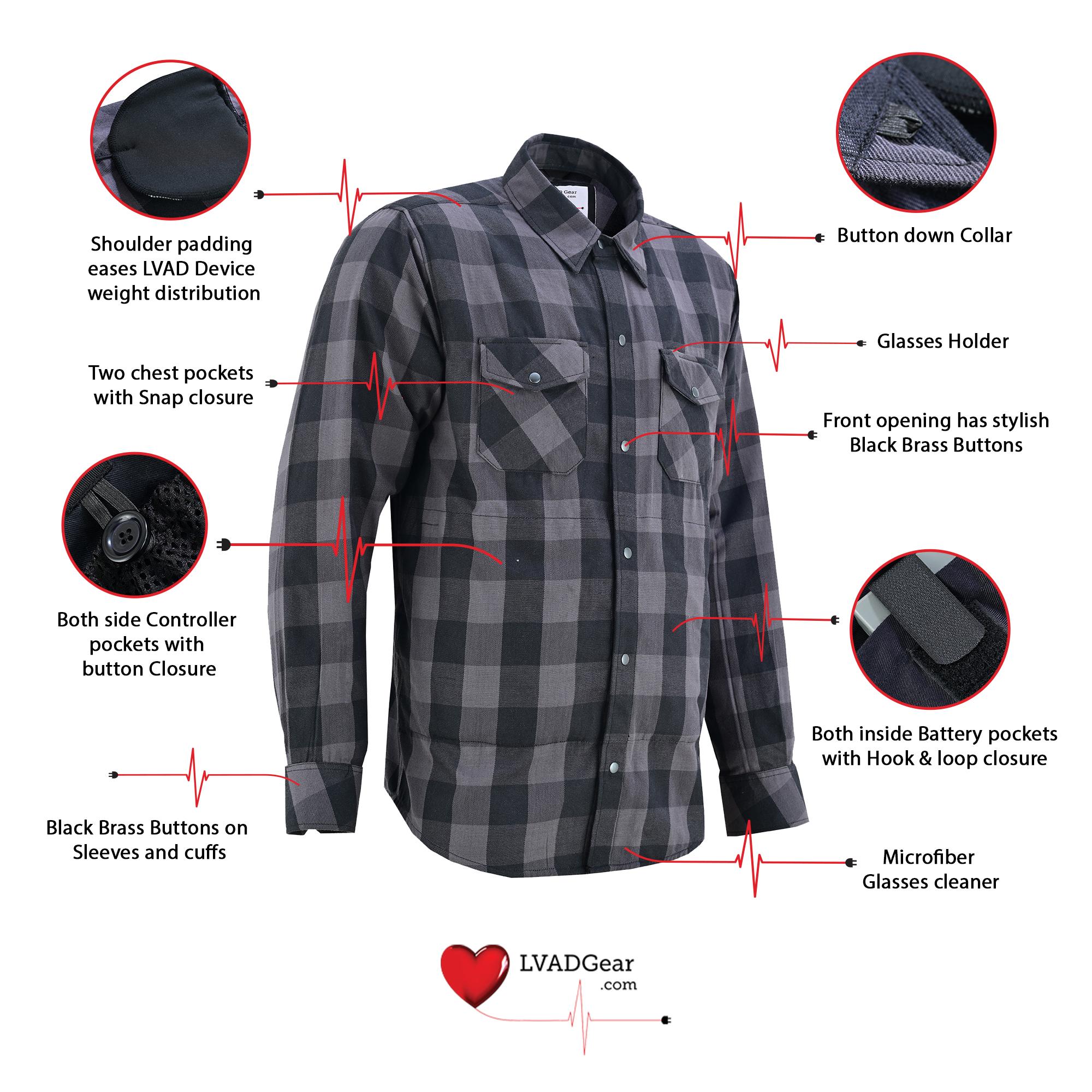 Every detail, from its specially designed battery pockets to the gentle lining for glasses cleaning, adds ease and convenience, so you feel prepared and supported throughout the day. This flannel looks good and feels reliable and durable, making it a perfect fit for everyday wear that easily matches LVAD patients' lifestyles.