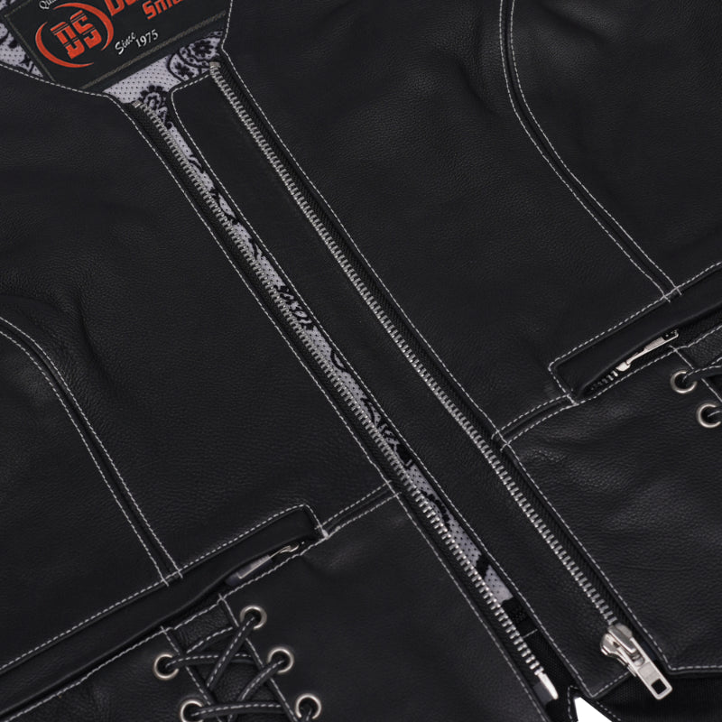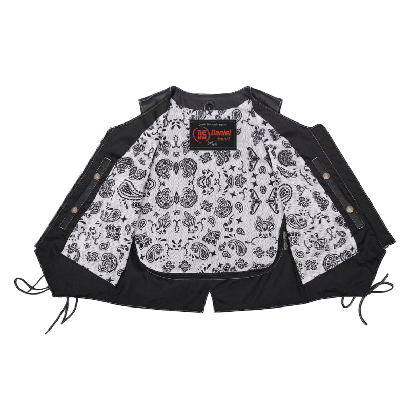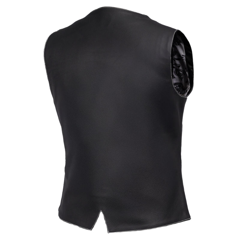 Looking for a stylish vest that combines elegance with practical features? The premium leather exterior offers a sleek, durable finish, while the soft mesh lining provides comfort and breathability. It includes stylish leather laces with metal rings for a customized fit, and high-quality white stitching adds a classic touch.