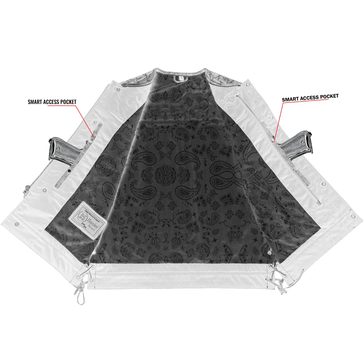- Dual interior concealed carry pockets with elastic holsters
