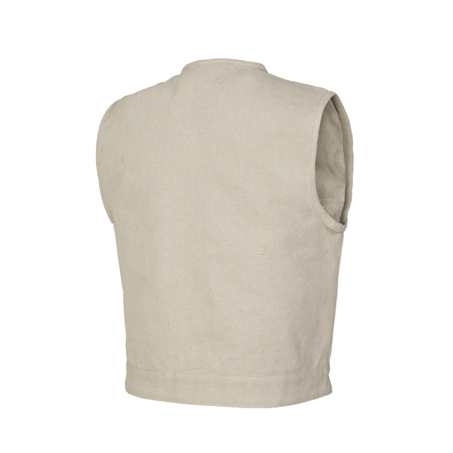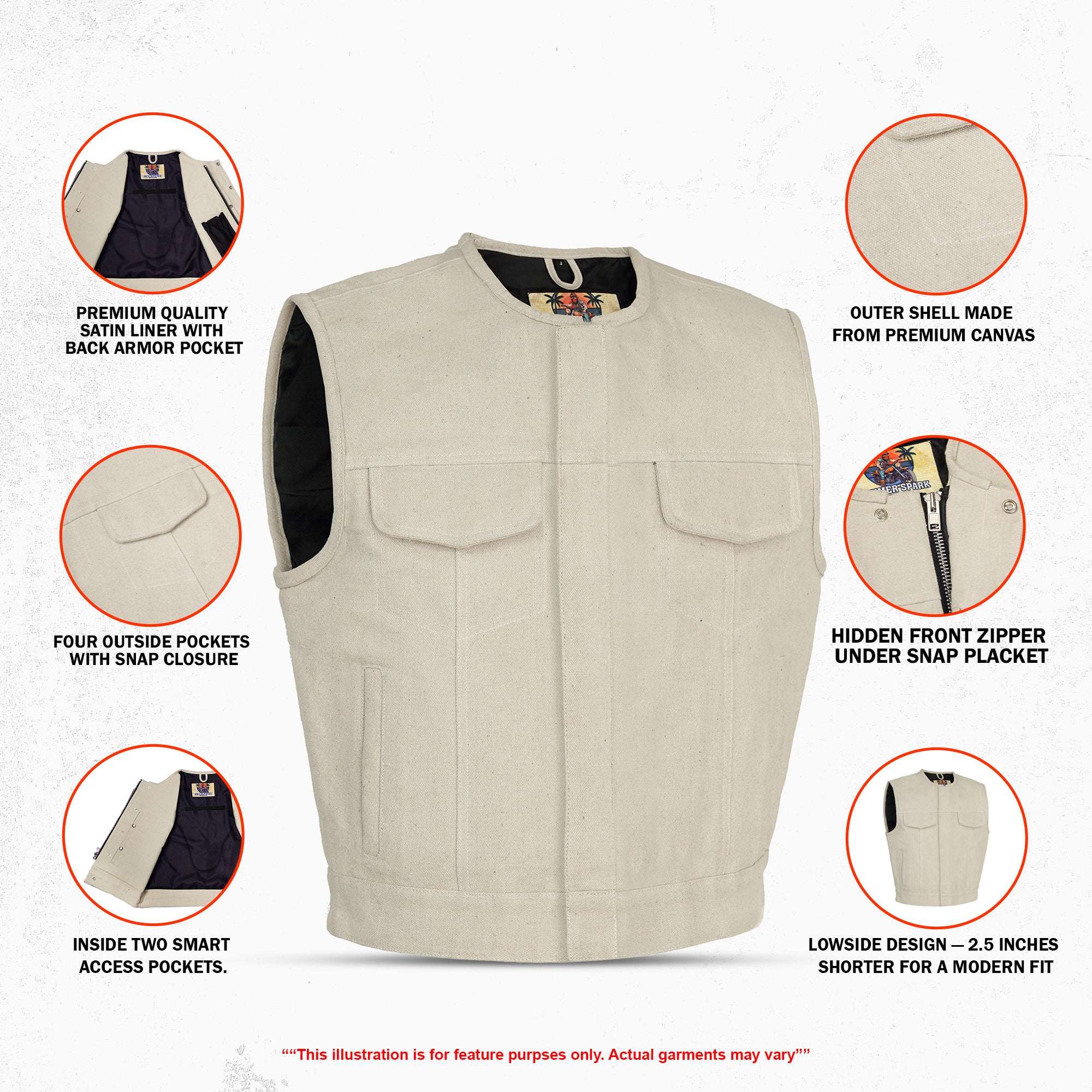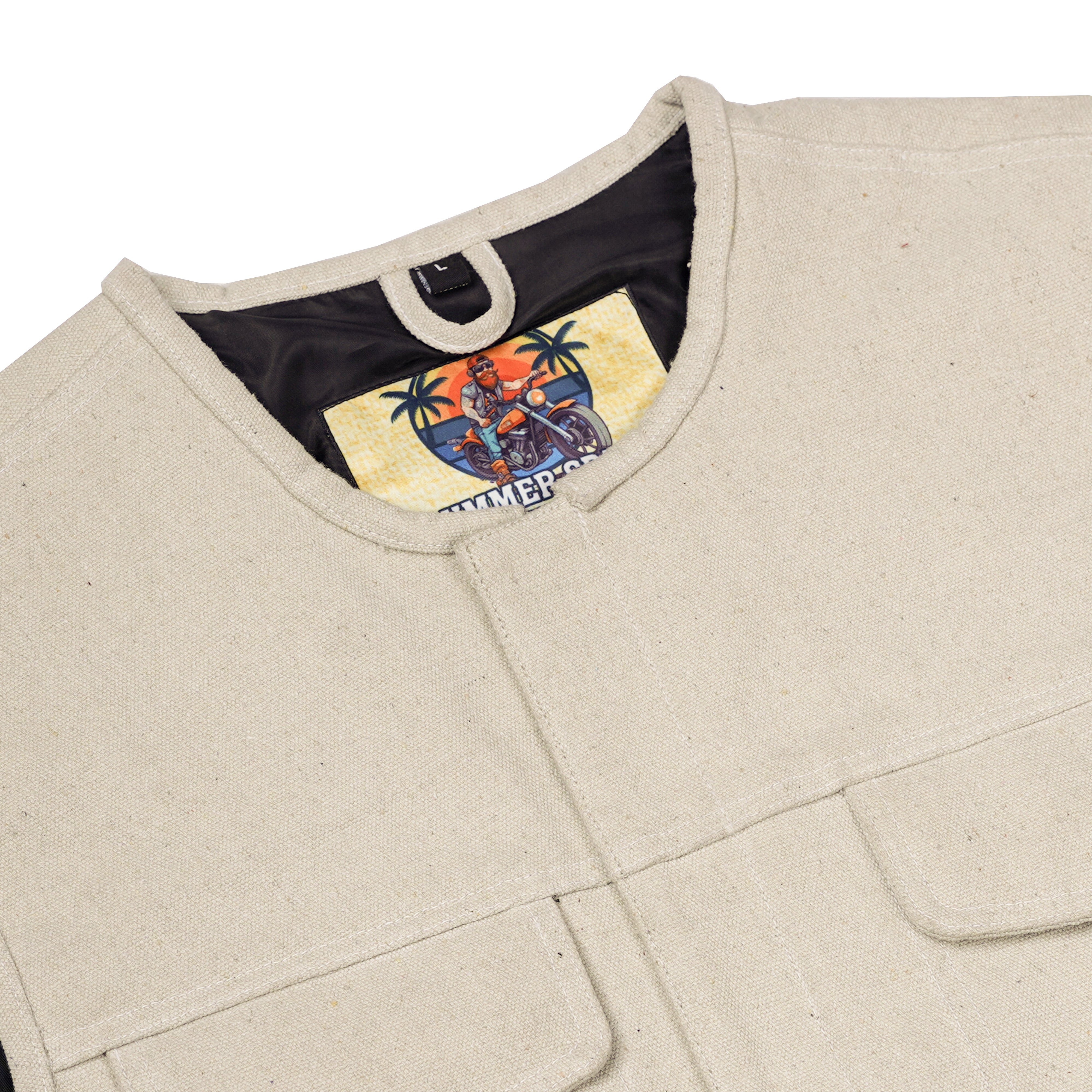 The Sand Dawn Men's Textile Vest combines rugged functionality with a refined canvas finish, designed for riders who seek lightweight comfort without compromising on utility or style. Built with a raw, full canvas outer shell and a soft Satin Inside liner, this vest keeps you covered, protected, and styled for the road ahead. Designed with reinforced shoulder support and Smart access pockets, a mobile pocket, and a protective back armor pocket, it's as tactical as it is timeless. The antique wax finish and clean back panel make it ideal for customization, while the hidden zipper and snap placket combo blocks wind and rain with ease. Whether you layer it over your hoodie or wear it as is, this vest delivers durability, versatility, and all-terrain confidence.