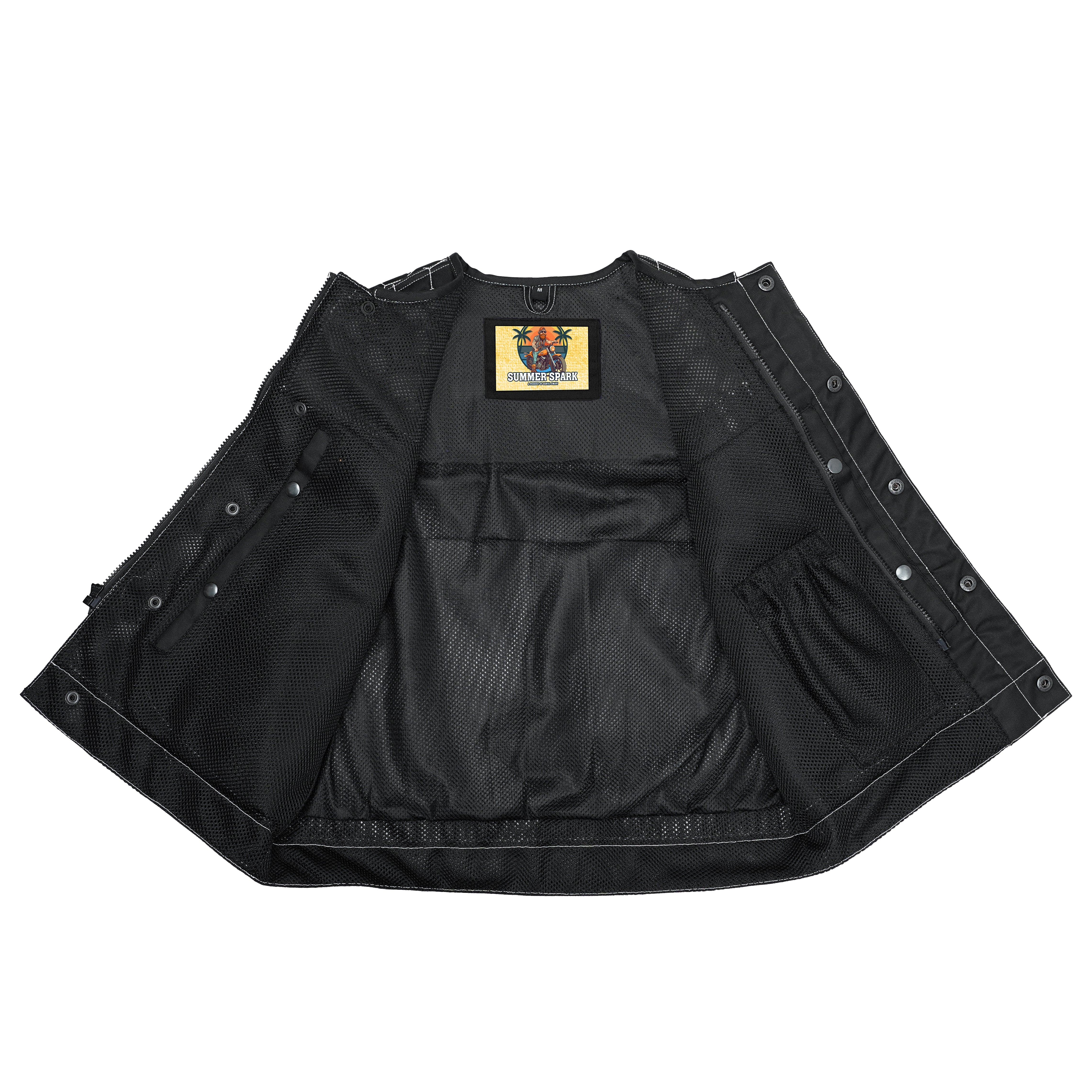 The Revenant Men's Textile Vest blends tactical functionality with classic biker styling. Crafted from premium black textile and finished with black and white leather braiding on both armholes, this vest is built for riders who demand comfort, durability, and bold design. Light quilting across the upper chest adds both warmth and texture, while the interior features a paisley-style print over a breathable mesh lining for all-day comfort.